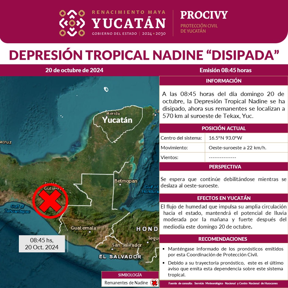 A las 08:45 horas del día domingo 20 de octubre, la Depresión Tropical "Nadine" se ha disipado, ahora sus remanentes se localizan a 570 km al suroeste de Tekax, Yucatán.