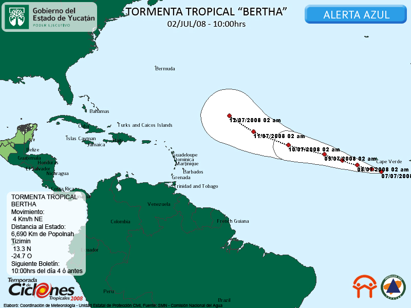Se espera que bertha continúe en la Categoría de Tormenta Tropical y con su actual desplazamiento, por lo que por el momento no representa riesgo alguno para el Estado.
