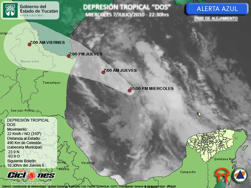 La Depresión Tropical DOS se encuentra a 490Km de Celestún Yucatán y a 425Km de Matamoros, Tamaulipas.