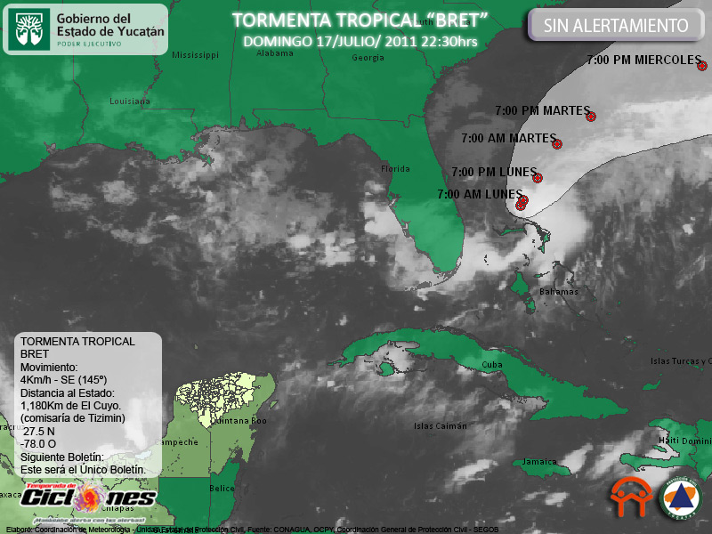 La Tormenta Tropical Bret no representa Peligro para la Península de Yucatán, por Consiguiente este será el único Boletín de Alertamiento emitido por la Unidad Estatal de Protección Civil en el marco del Sistema de Alerta Temprana para Ciclones Tropicales.