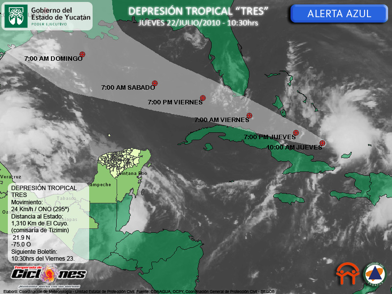 Distancia del centro de la depresión tropical al Estado de Yucatán: 1,310 Kms. de El Cuyo, Comisaría de Tizimin.