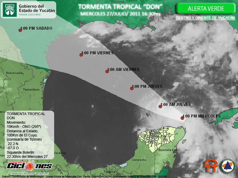 Derivado de la intensa Onda Tropical #12 Se ha formado esta tarde la Tormenta Tropical "DON" en el Sureste del Golfo de México, a 100Km al Noreste de El Cuyo, Comisaría de Tizimin. Imágenes de Satélite indican que la principal actividad asociada se encuentra al Norte de dicho Sistema aún que tambien se observa desarrollo de nublados en el Norte de nuestra entidad, así como en el vecino estado de Quintana Roo.