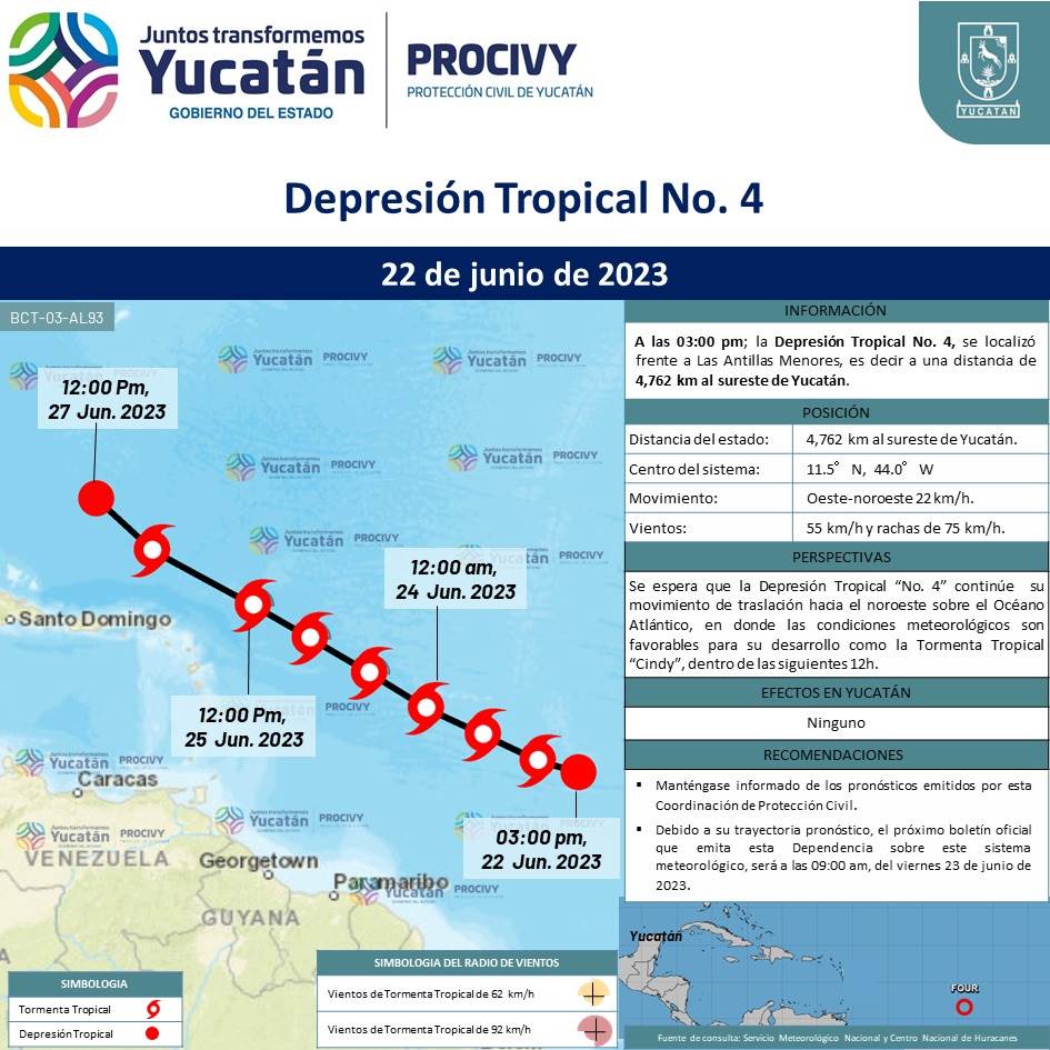 A las 03:00 pm; la Depresión Tropical No. 4, se localizó frente a Las Antillas Menores, es decir a una distancia de 4,762 km al sureste de Yucatán; se mueve al oeste-noroeste 26 km/h con vientos de 55 km/h y rachas de 75 km/h, debido a su trayectoria pronóstico y distancia, no representa riesgo para el estado.
