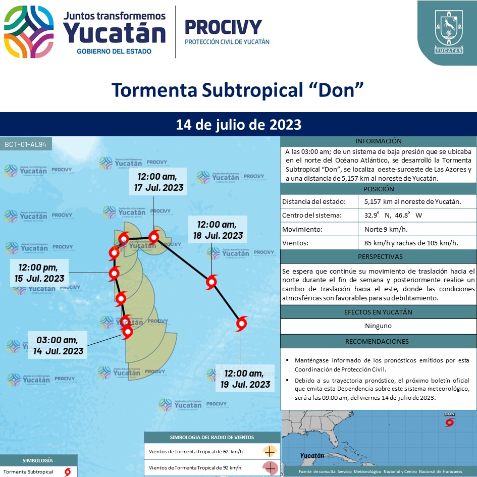 Tormenta Subtropical Don al norte del Océano Atlántico, se localiza a una distancia de 5,157 km al noreste de Yucatán.