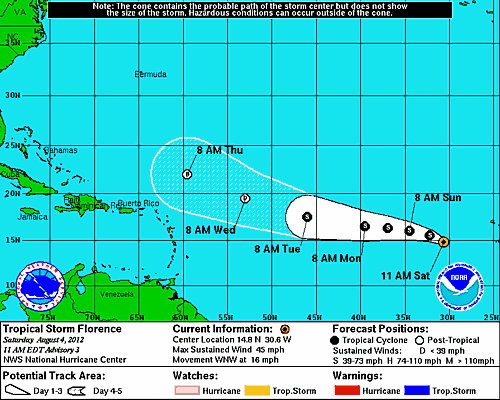 Ayer por la noche se formó la Tormenta Tropical Florence sobre el Océano Atlántico, presenta un desplazamiento general hacia el Oeste/Noroeste a razón de 26Km/h.