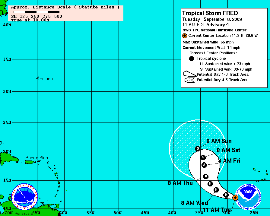 La Tormenta Tropical Fred en el lejano Atlántico Oriental, muy cerca de las costas Africanas, continúa con su desplazamiento hacia el Oeste , esperandose fortalecimiento adicional y se convierta en Huracán.