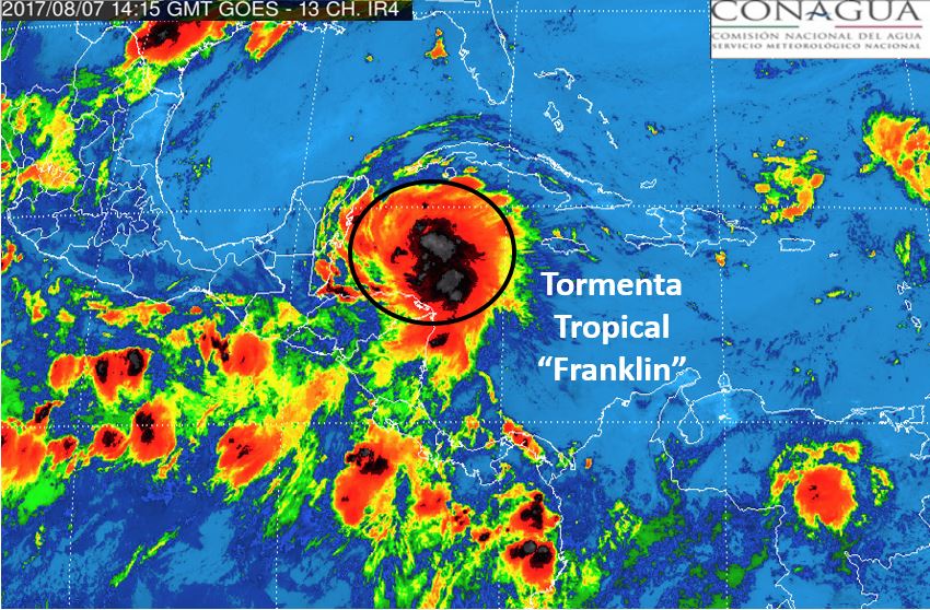 La Tormenta Tropical "FRANKLIN" en el occidente del Mar Caribe continúa acercándose a las costas de Quintana Roo. Sus bandas nubosas afectan a la Península de Yucatán.