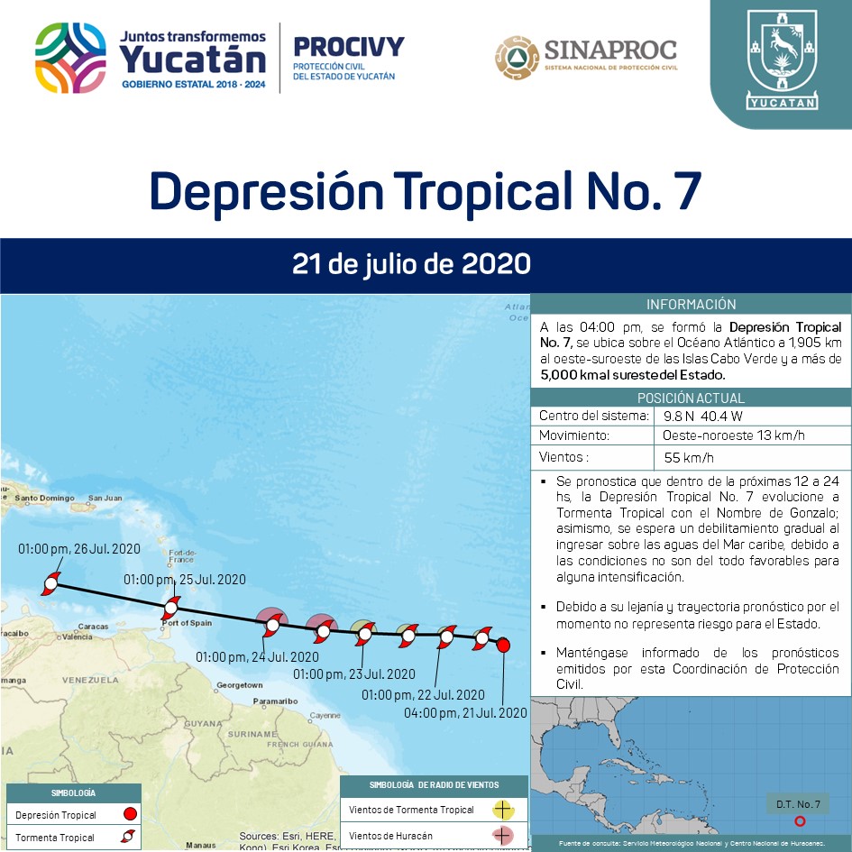 A las 04:00 pm, se formó la Depresión Tropical No. 7, se ubica sobre el Océano Atlántico a 1,905 km al oeste-suroeste de las Islas Cabo Verde y a más de 5,000 km al sureste del Estado, se mueve al Oeste-noroeste 13 km/h con vientos de 55 km/h.