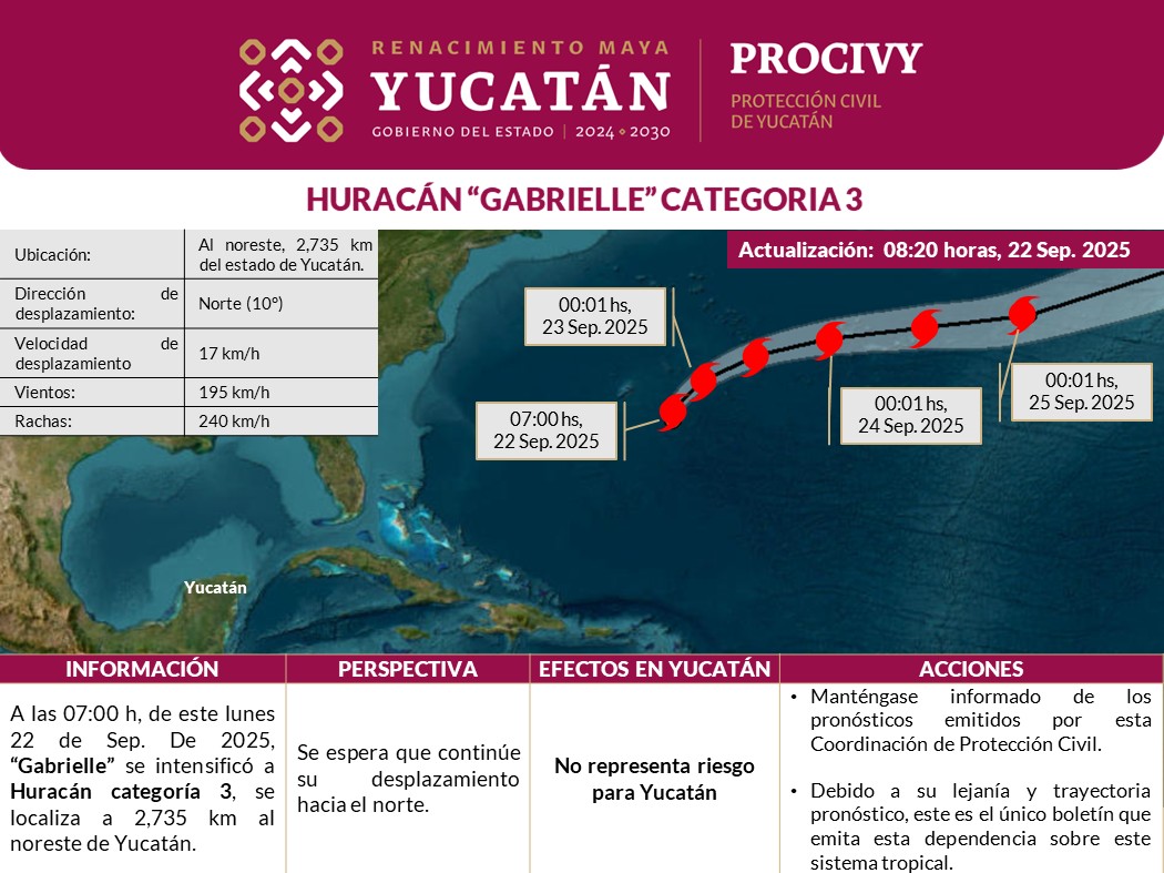 "Gabrielle" se intensificó a Huracán categoría 3, se localiza a 2,735 km al noreste de Yucatán.
