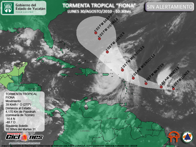 Será necesario observar el desarrollo de este Sistema durante los próximos días para poder descartar por completo alguna posible afectación a la península de Yucatán, no obstante, los escenarios presentados hoy por la tarde, mantienen a la Península de Yucatán y el Mar Caribe fuera de la Trayectoria de FIONA.