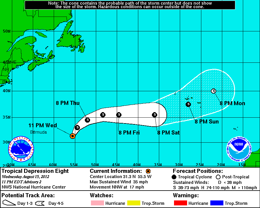 La Depresión Tropical # 8 se encuentra esta noche a 885Kms al Este de Bermuda en el Océano Atlántico Norte.