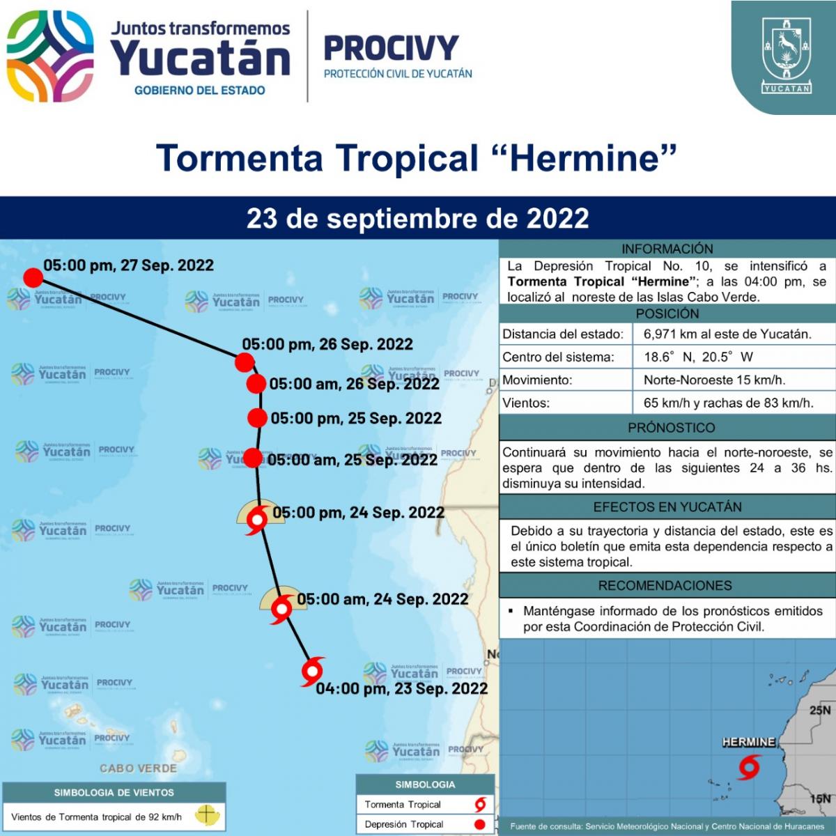 La Depresión Tropical No. 10, se intensificó a Tormenta Tropical "Hermine", se localiza al noreste de las Islas Cabo Verde.
