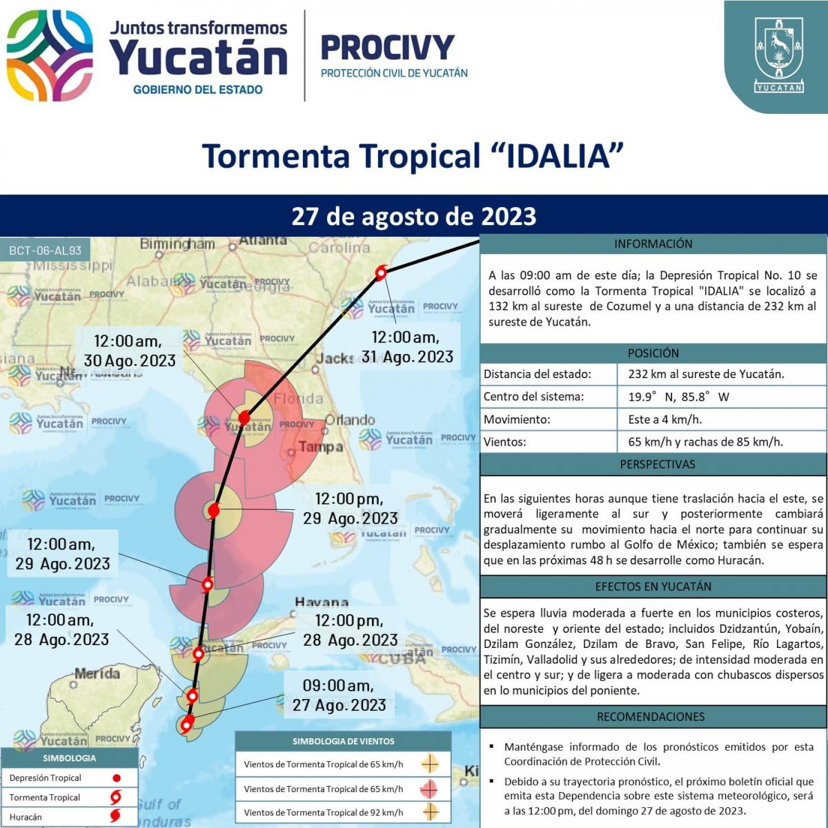 La Depresión Tropical No. 10, se desarrolló como la Tormenta Tropical #Idalia, se localizó a 132 km al sureste de Cozumel a una distancia de 232 km al sureste de Yucatán.