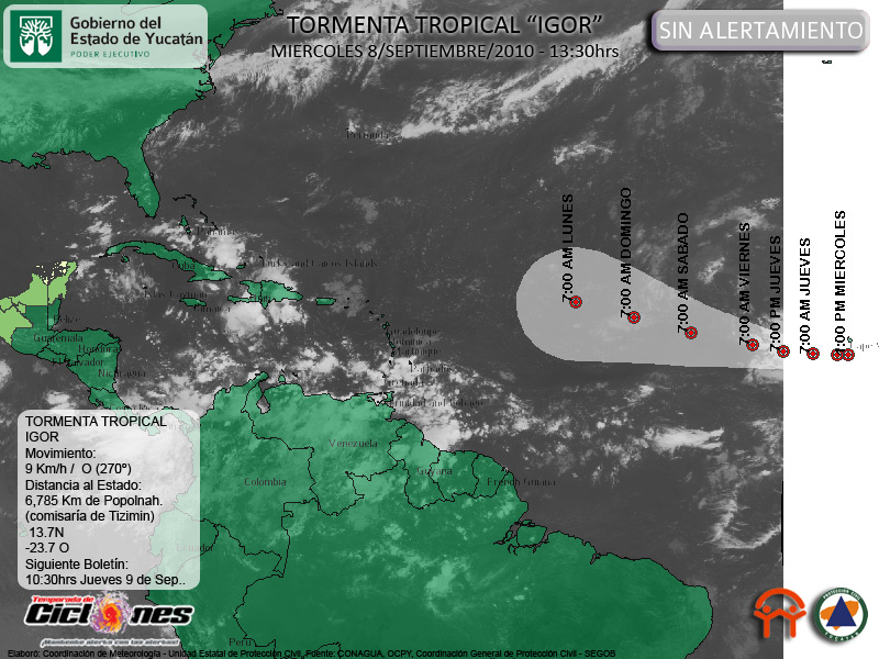 Será necesario observar el comportamiento de la Tormenta Tropical IGOR durante los próximos días, para descartar definitivamente alguna posible afectación a la Península de Yucatán, situación que no puede predecirse con certeza por el momento.