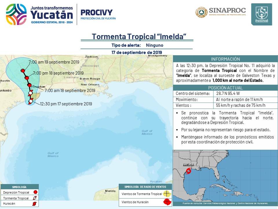 La Depresión Tropical No. 11 evolucionó a Tormenta Tropical "Imelda". Se encuentra al suroeste de Galveston, Texas en los Estados Unidos.