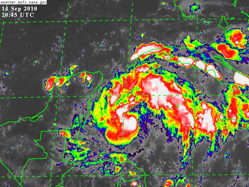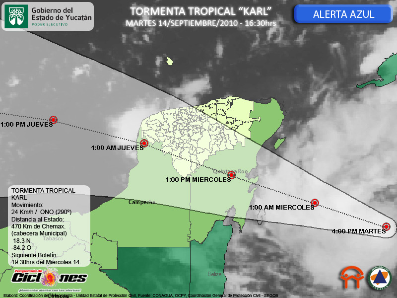 La Baja Presión Ubicada en el Mar Caribe, da origen esta tarde a la Tormenta Tropical KARL a 430Km de Chetumal, Quintana Roo, 470Km de la cabecera Municipal de Chemax, Yucatán.