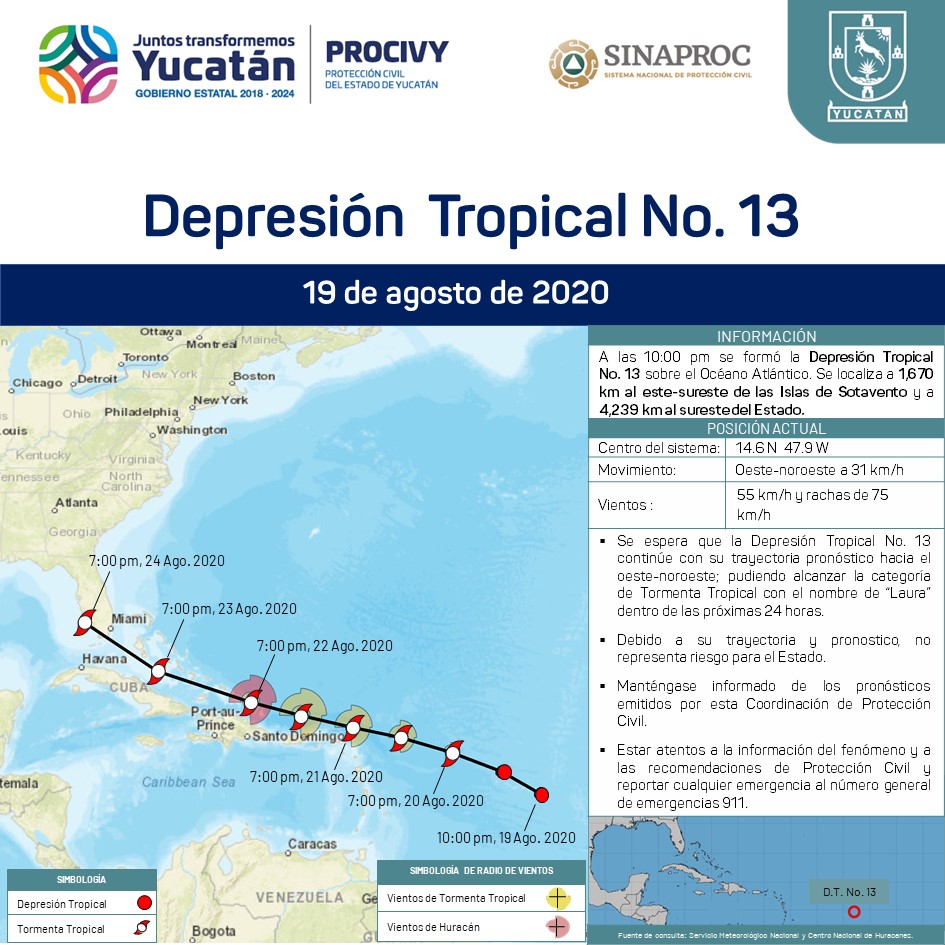 A las 10:00 pm se formó la Depresión Tropical No. 13 sobre el Océano Atlántico. Se localiza a 1,670 km al este-sureste de las Islas de Sotavento.