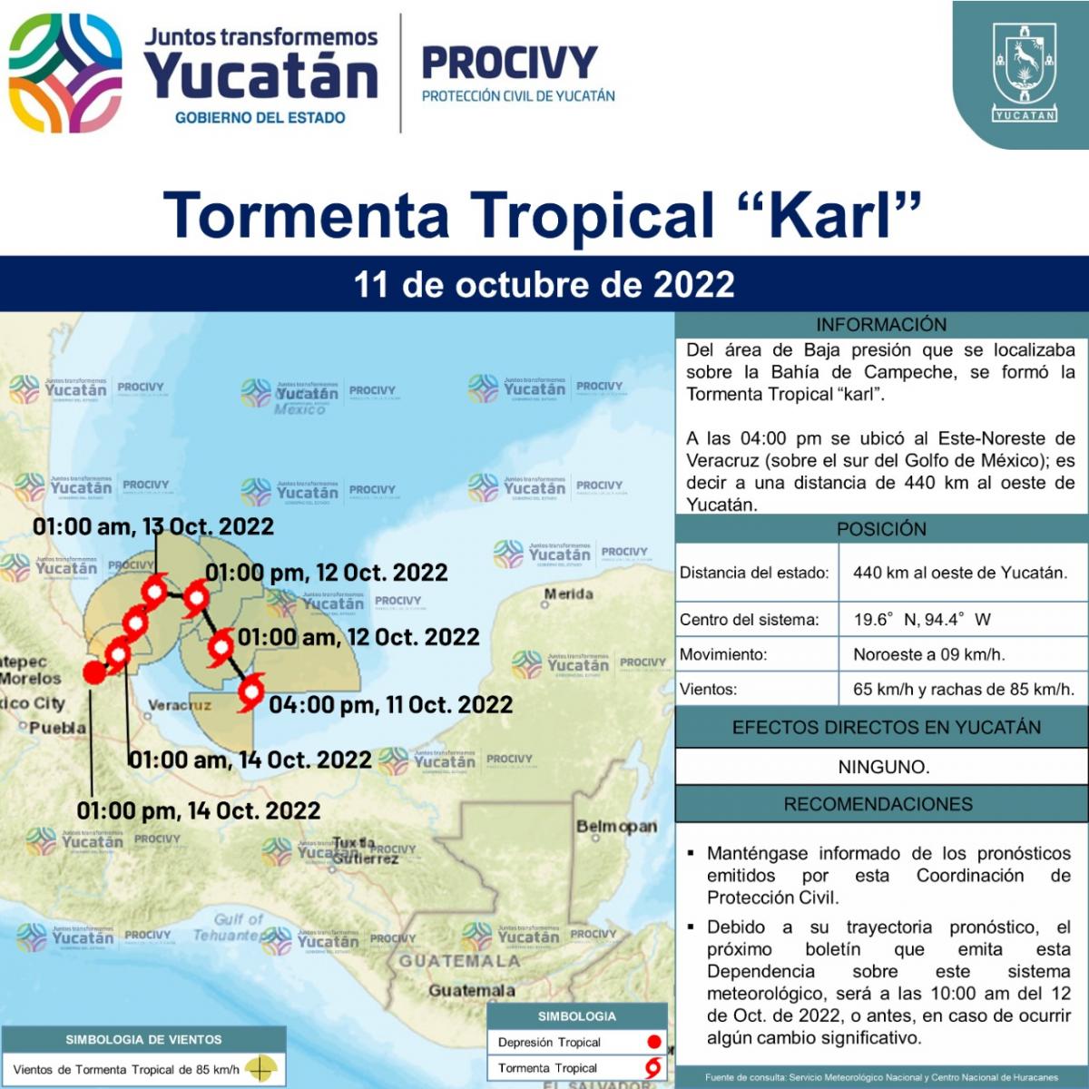 Del área de Baja presión que se localizaba sobre la Bahía de Campeche, se formó la Tormenta Tropical "Karl"; a las 04:00 pm se ubicó al Este-Noreste de Veracruz (sobre el sur del Golfo de México); es decir a una distancia de 440 km al oeste de Yucatán; se mueve al noroeste a 09 km/h con vientos de 65 km/h y rachas de 85 km/h.