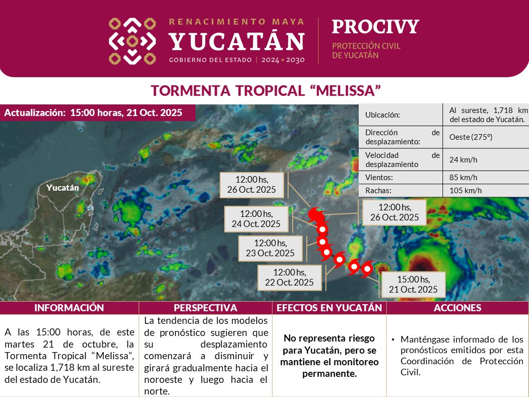 Los modelos de pronóstico continúan sugiriendo que la velocidad de traslación de "Melissa" comenzará a disminuir en los siguientes días y girará, de manera gradual, hacia el noroeste y después hacia el norte.