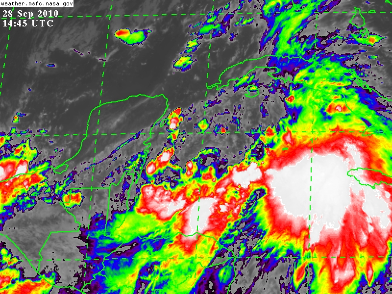 Presenta vientos de 55Km/h con rachas de hasta 75Km/h, su centro se estima a 290Km al Sur de la Habana, Cuba, 530Km de Popolnah, Comisaría de Tizimin.