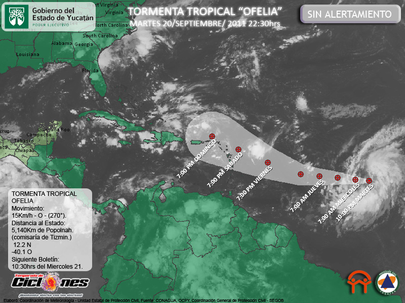 Se ha formado esta noche la Tormenta Tropical Ofelia, cuya posición es estimada a 2,555Kms de las Islas Leward en las Antillas menores, 5,140Kms de Popolnah, Comisaría de Tizimín, Yucatán.