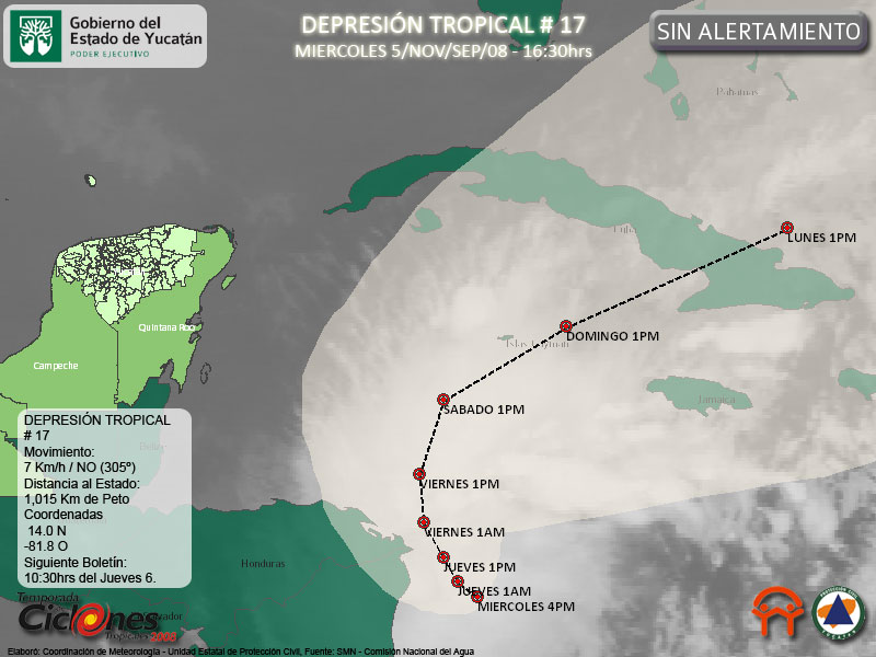 La Depresión Tropical # 17 se ha formado frente a las costas de Nicaragua en el Mar Caribe, su centro se estima a 850 Km de Chetumal, Quintana Roo y a 1,015 Km de Peto Yucatán.