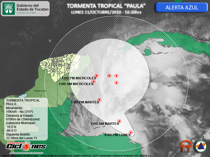 Debido a la situación actual y trayectoria pronóstico, se decreta Alerta Azul para el Estado de Yucatán por la Tormenta Tropical Paula, situación la cual podría variar durante las próximas 24hrs dependiendo de su comportamiento.