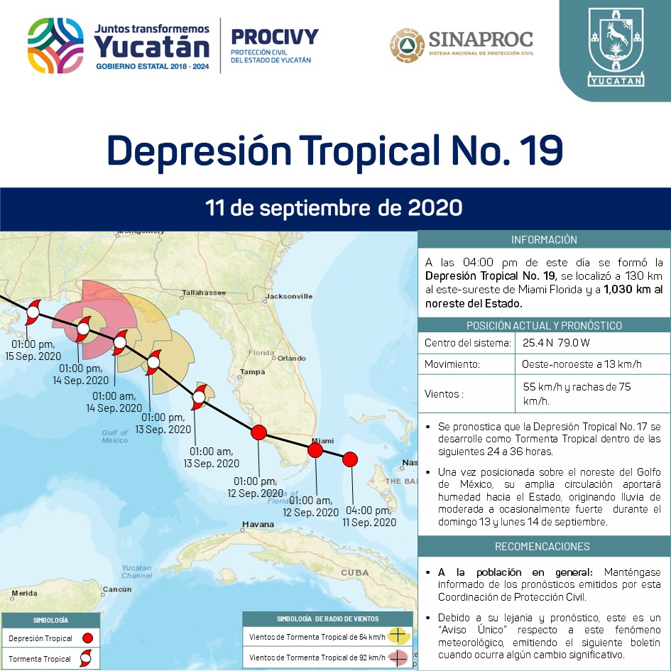 Se forma la Depresión Tropical No. 19; se localiza a 130 km al este-sureste de Miami, Florida, E.U.A.,