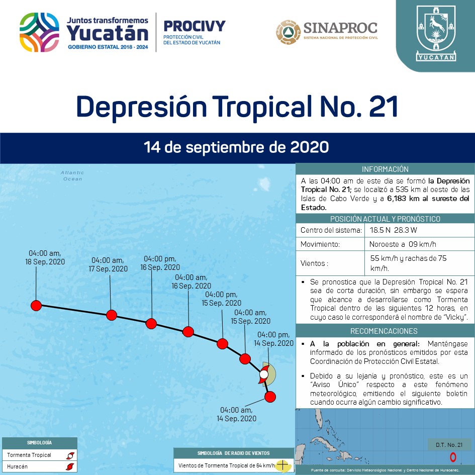 Se formó la Depresión Tropical No. 21; se localiza a 535 km al oeste de las Islas de Cabo Verde, África, y a 6,183 km al sureste del Estado; se desplaza hacia al a una velocidad de 9 km/h con vientos de 55 km/h.