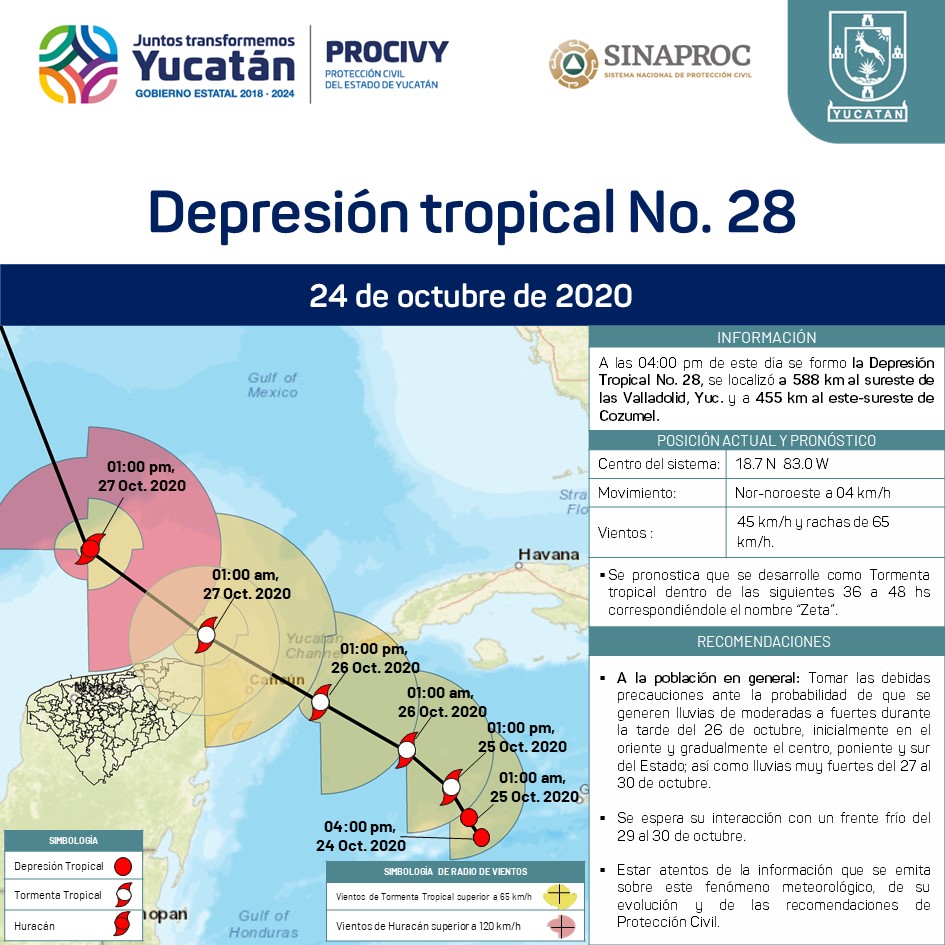 Se formó la Depresión Tropical No. 28 a 588 km al sureste de Valladolid, Yucatán.