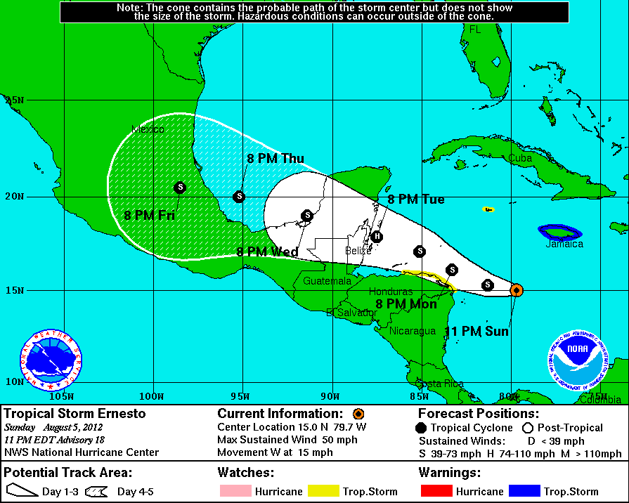 Como se mencionó en el Boletín anterior se espera que la Tormenta Tropical Ernesto se mantenga en esta categoría durante las próximas horas, sin embargo no se descarta que la misma se intensifique a un huracán de Categoría UNO en la Escala Saffir Simpson antes de desplazarse sobre el Continente en las Costas de Belice ó la Frontera Belice, México, cerca de Chetumal, Quintana Roo.