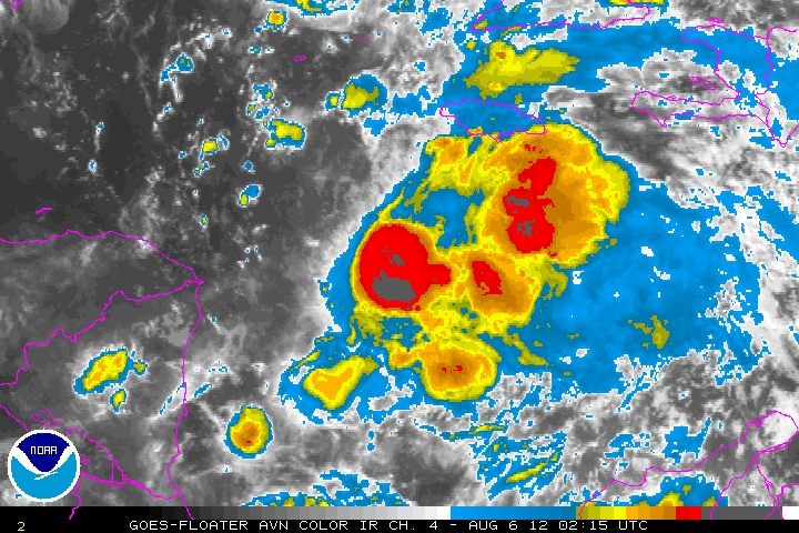 Ernesto continúa registrando vientos de 85Km/h y rachas de hasta 100Km/h, las cuales se extienden principalmente hacia el Noreste de su centro. Presenta un desplazamiento hacia el Oeste a razón de 24Km/h.