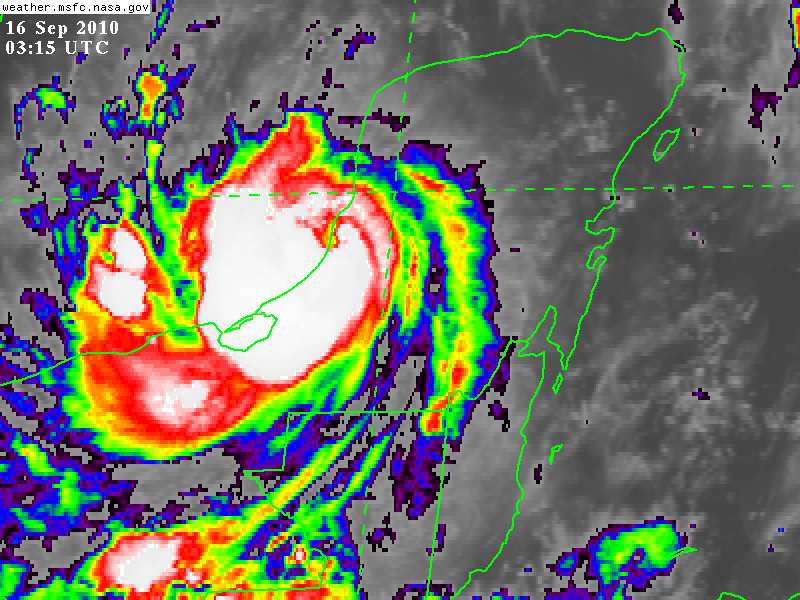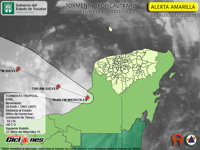 El centro de Karl practicamente desplazandose sobre Aguas del Golfo de México en las inmediaciones de Champotón, Campeche, con vientos de 65Km/h continúa como una Tormenta Tropical debil.