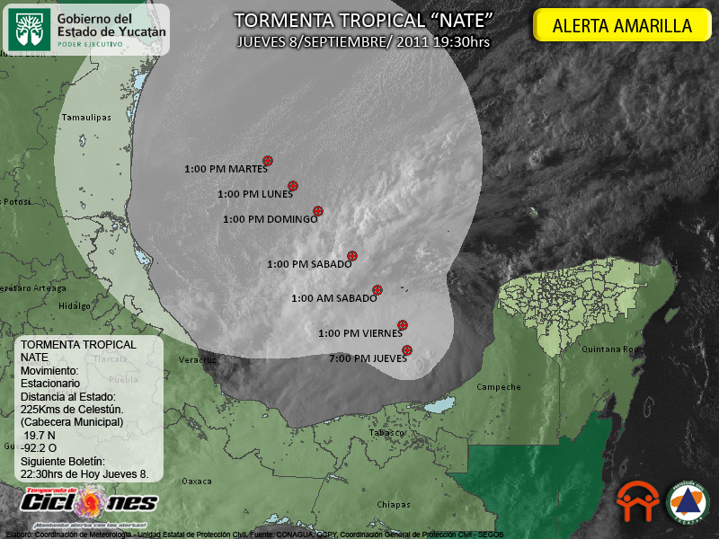El Centro de la Tormenta Tropical Nate se estima a las 19:00hrs a 120Kms al Noroeste de Ciudad del Carmen Campeche, 225Kms de Celestún Yucatán, sin embargo vientos de Tormenta Tropical se extienden hasta 85Kms al Noreste de su centro, por lo que vientos fuertes son estimados a 140Kms de Celestún.