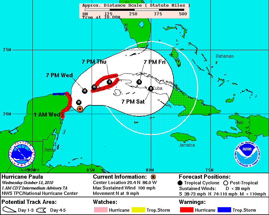 Se espera que el Huracán Paula continúe con su desplazamiento hacia el Norte, y que presente un recurvamiento hacia el Noreste durante el día de hoy Miercoles, frente a la Costa Norte de Quintana Roo.