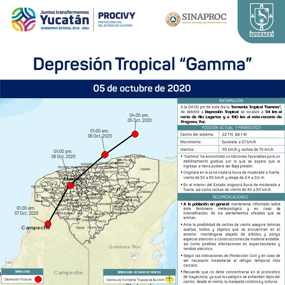 La Tormenta Tropical Gamma, se debilitó a Depresión Tropical, se localiza a 54 km al norte de Río Lagartos.