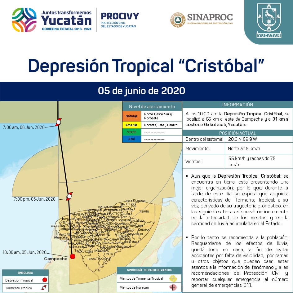 A las 10:00 am la Depresión Tropical Cristóbal, se localizó a 65 km al este de Campeche y a 31 km al oeste de Oxkutzcab, Yucatán, se mueve hacia el Norte a razón de 19 km/h con vientos de 55 km/h y rachas de 75 km/h.