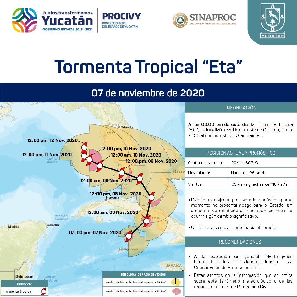 La Tormenta Tropical Eta; se localiza a 135 km al nor-noreste de Gran Caimán.