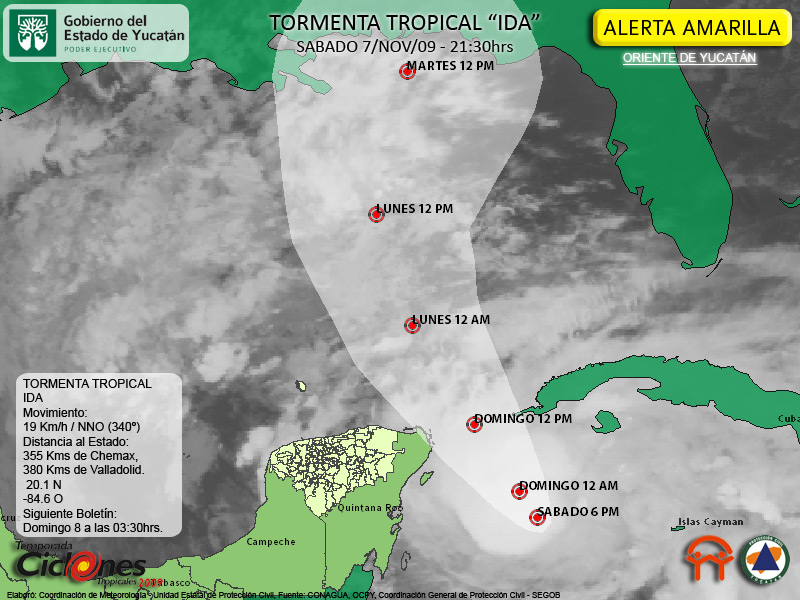 Se espera que la Tormenta Tropical IDA se intensifique a Huracán Categoría UNO en la Escala Saffir Simpson, y se desplace sobre el Canal de Yucatán durante mañana Domingo.