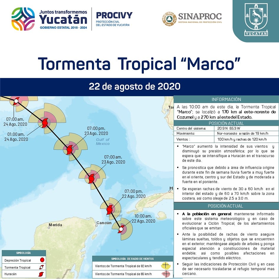 Ante la cercanía de la Tormenta tropical #Marco, el Sistema Nacional de #ProtecciónCivil establece la Alerta Amarilla para los municipios del oriente de #Yucatán, e informa que la Alerta Verde continúa para el centro y sur; y Alerta Azul para el resto del Estado.