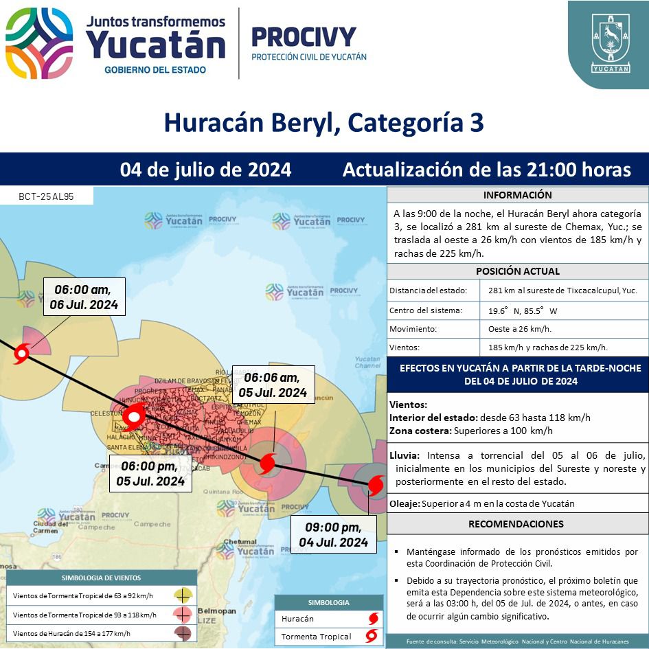 A las 9:00 de la noche, el Huracán Beryl ahora categoría 3, se localizó a 281 km al sureste de Chemax, Yucatán.