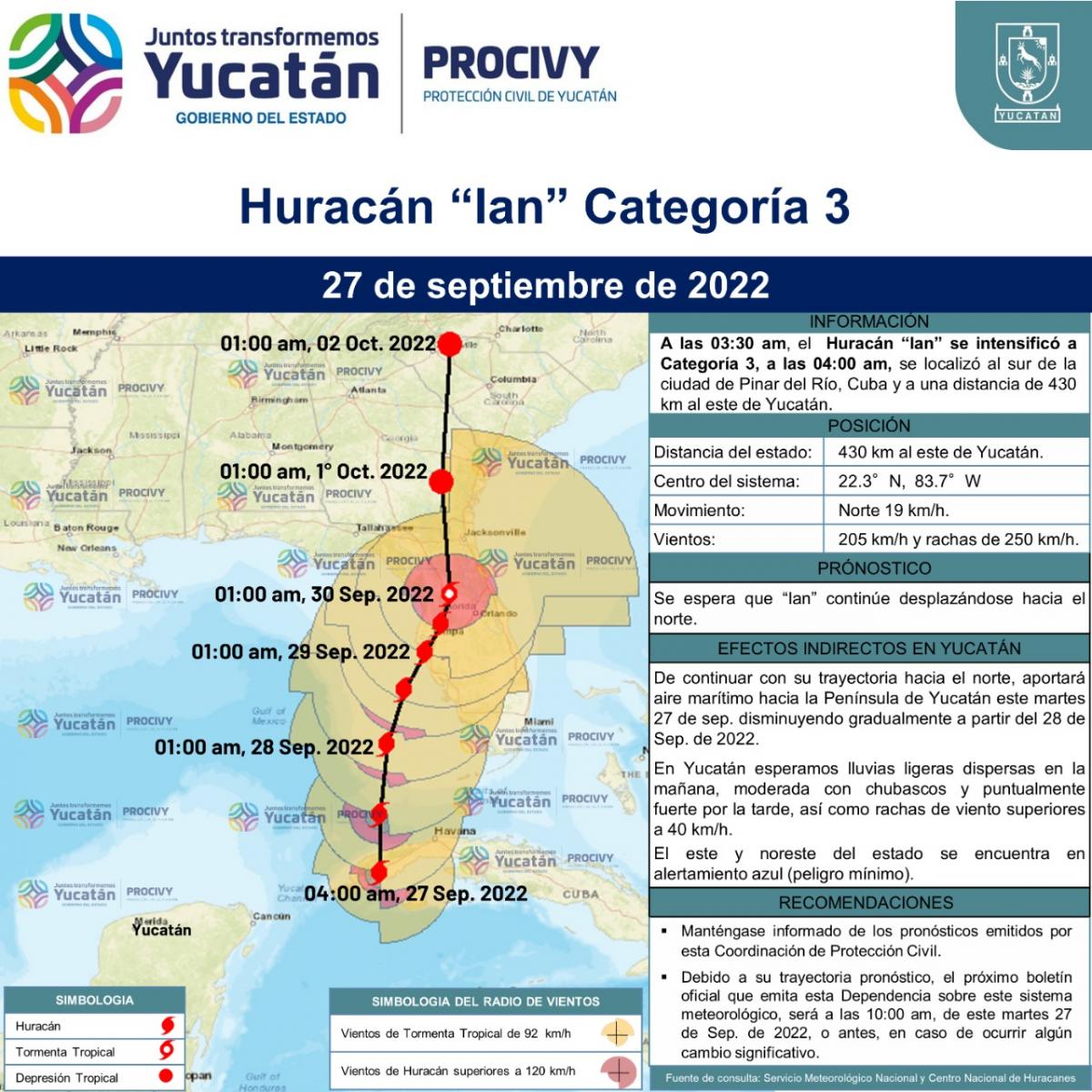 A las 03:30 am, el Huracán "Ian" se intensificó a Categoría 3, a las 04:00 am, se localizó al sur de la ciudad de Pinar del Río, Cuba.