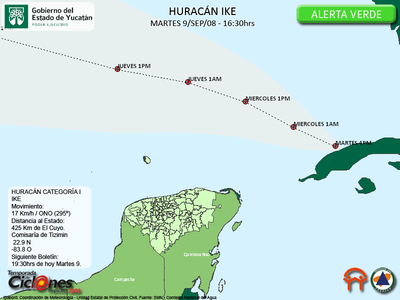 Se espera que IKE continúe su desplazamiento hacia el Noroeste durante las próximas horas, en este sentido, el punto mas cercano al Estado sería mañana Miercoles por la mañana.