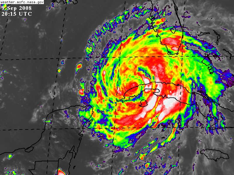 IKE Sobre Aguas del Golfo de México en el Oeste de Cuba aún como un Huracán Categoría I en la Escala Saffir Simpson.