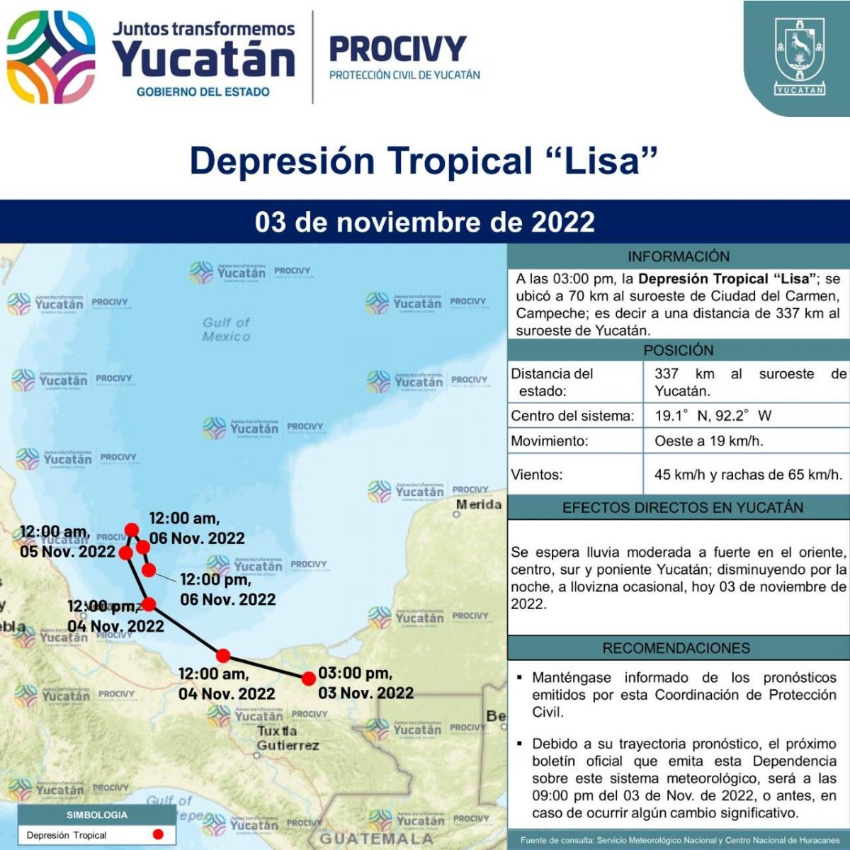 La Depresión Tropical "Lisa"; se ubicó a 70 km al suroeste de Ciudad del Carmen, Campeche.
