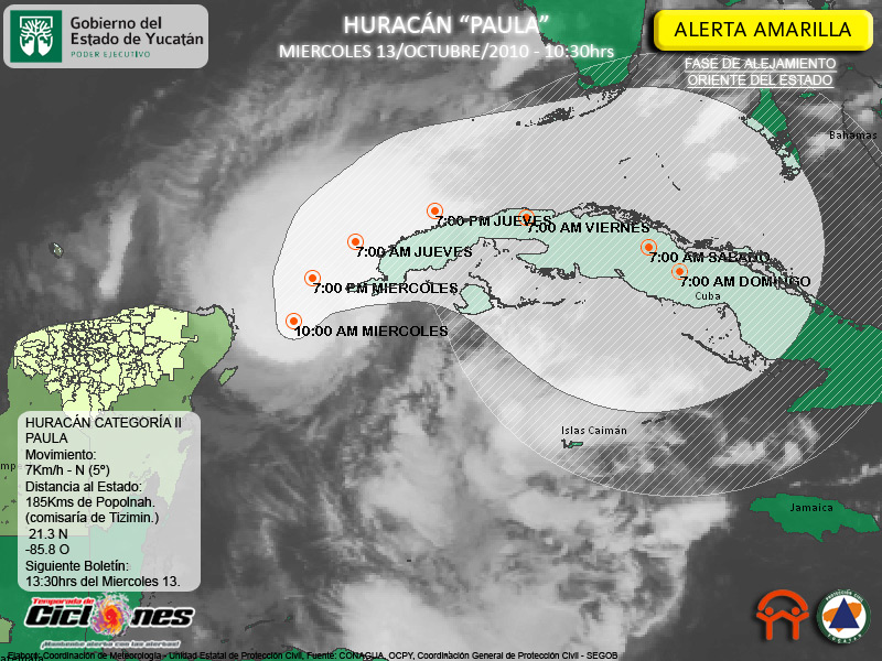 Se espera que el Huracán Paula comience a presentar un recurvamiento gradual hacia el Noreste durante el día de hoy Miercoles, para dirigirse hacia la Costa Norte de Cuba, a la cual el Centro del Huracán Paula se estaría aproximando las primeras horas de mañana Jueves.