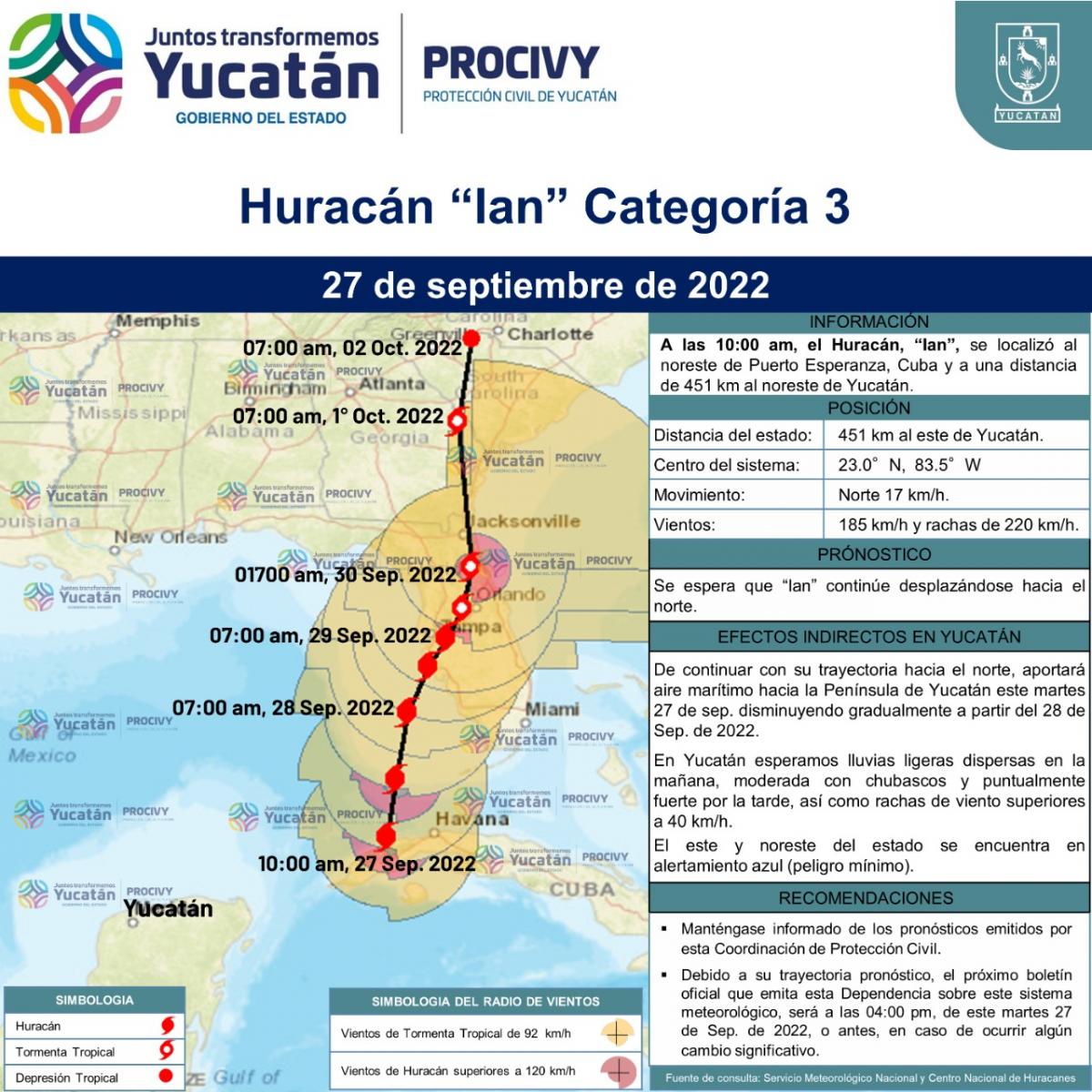 A las 10:00 am, el Huracán, "Ian", se localizó al noreste de Puerto Esperanza, Cuba y a una distancia de 451 km al noreste de Yucatán; se mueve al norte (5°) a 17 km/h con vientos de 185 km/h y rachas de 220 km/h, se espera que "Ian" continúe desplazándose hacia el norte.