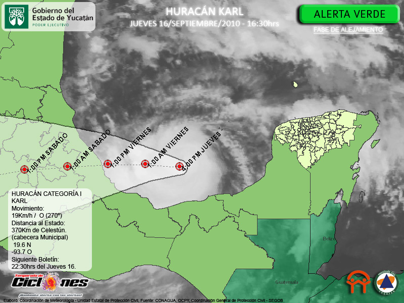 Se espera que Karl alcance las Costas del Estado de Veracruz cerca del medio día de mañana Viernes 17 de Septiembre.