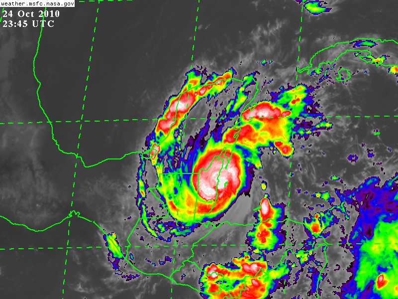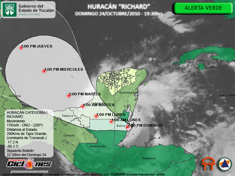 El Centro del Huracán Richard próximo a impactar Belice, a 30Km al Este de Belmopán, capital de dicho país, 145Km al Sur de Chetumal, Quintana Roo, y a 290Km de Tigre Grande, Comisaría de Tzucacab, Yucatán, con vientos de 150Km/h y rachas de hasta 175Km/h.