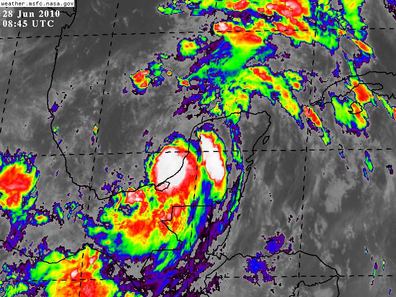 El Centro de la Tormenta Tropical se estima aproximadamente a 100Km al Noroeste de Champoton, Campeche, 180Km al Suroeste de Halachó, Yucatán. Sus bandas nubosas ocasionan chubascos en algunos Municipios del Poniente de nuestra entidad.